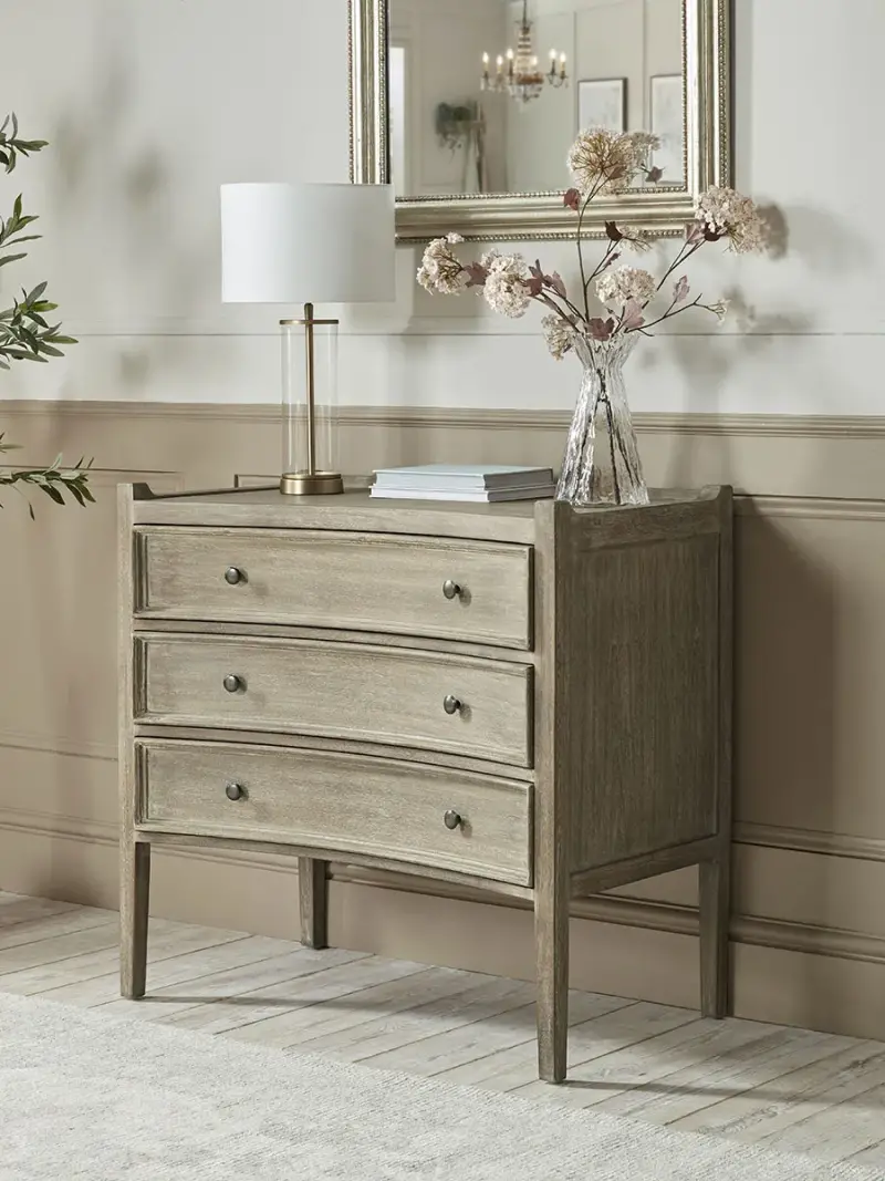 Traditional in style, our Felice Chest of Drawers has a unique curved front, creating a softness and elegance for your space.Finished with delicate metal handles, this chest of drawers has three drawers, with ideal storage space for keeping your home looking neat and organised.
