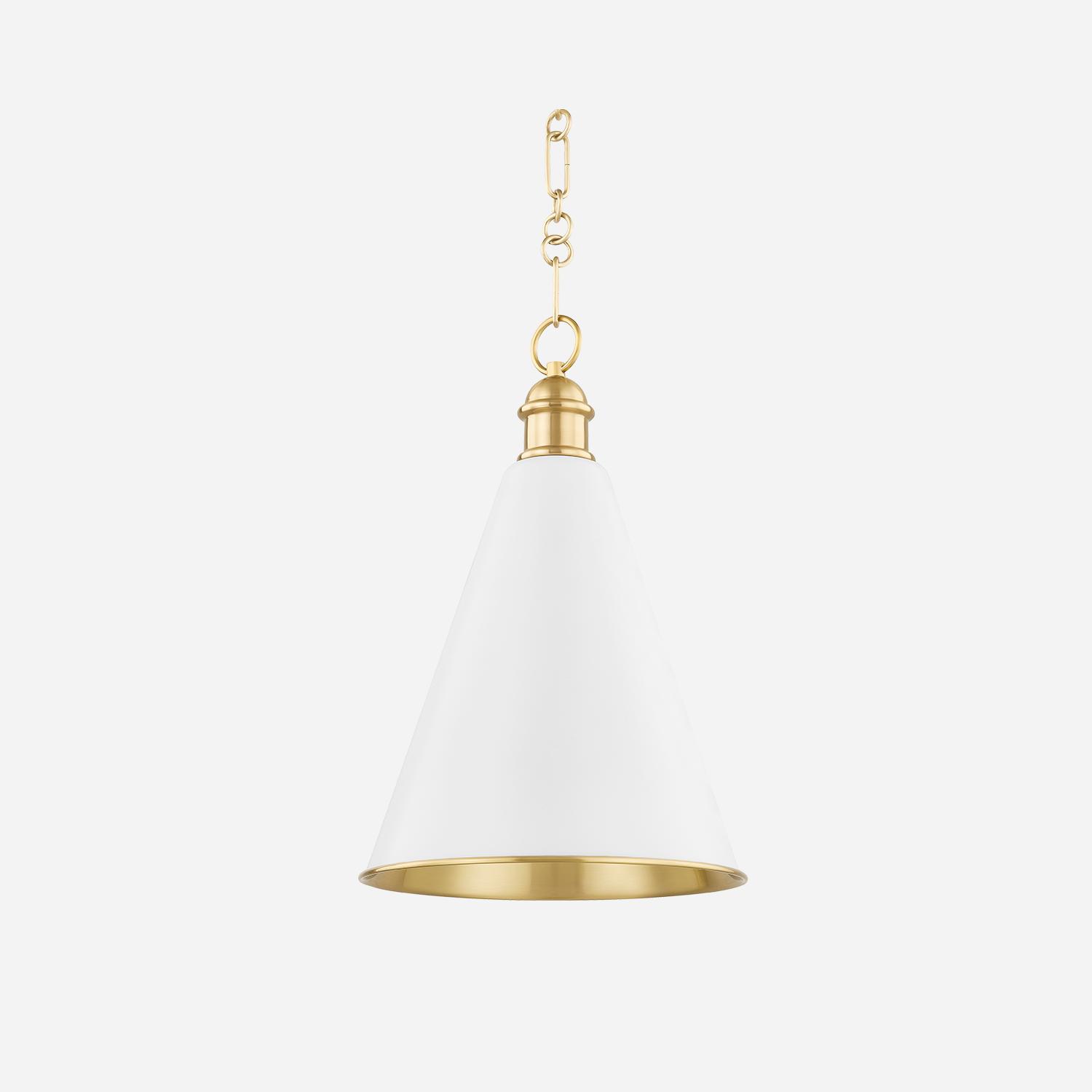 Discover the Fenimore Pendant Light in Soft White. A conical design with Aged Brass interior and intricate details, perfect for adding style and elegance to any space. Fenimore Pendant Soft White, Light - Andrew Martin