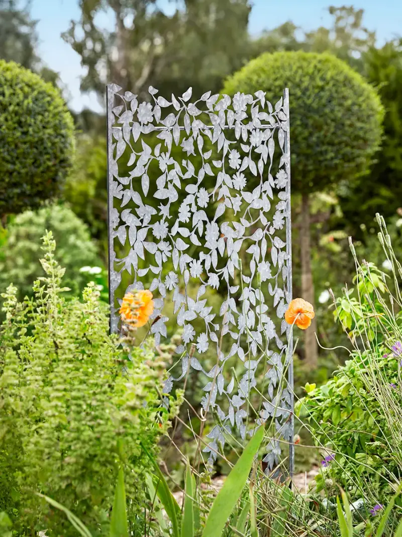 The lovely silvery tones of our Filigree Leaf Outdoor Panel will provide an enchanting backdrop to both greenery and hard landscaping, such as brick walls or timber fencing.Made up of trailing patterns of leaves and flowers, the panel will create an elegant screen while planting becomes established, as well as adding structure to your outdoor space.