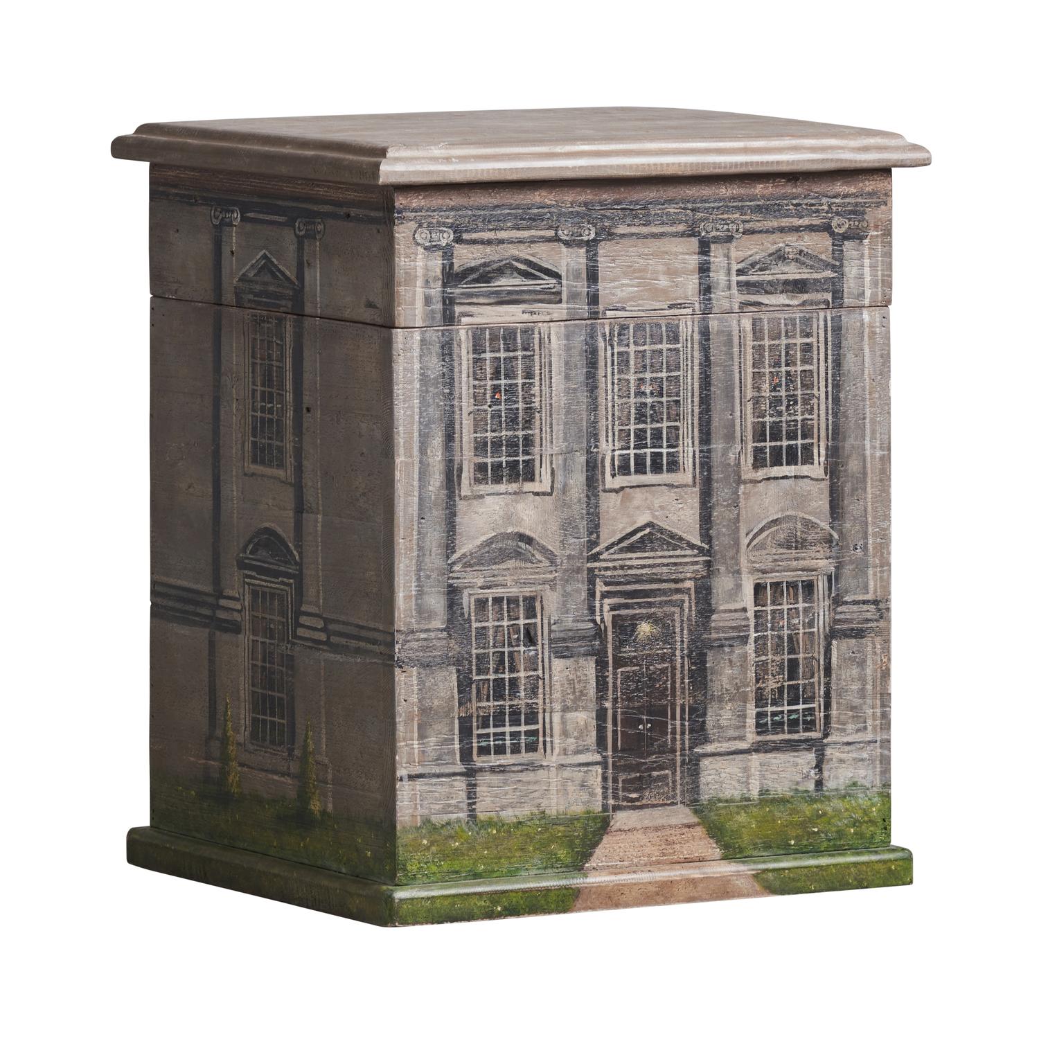 Hand-painted side table and storage trunk in reclaimed pine. Features a whimsical Georgian townhouse façade and striped cotton-lined interior. Filippo, Side Table - Andrew Martin