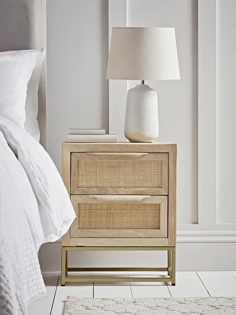 Crafted from beautiful mango wood with the natural grain still visible, with two spacious drawers fronted by woven flat rattan and all perched atop a sturdy brass-coloured iron frame to allow for additional storage underneath, our simply stylish Flat Rattan Webbing Bedside Table will slot easily into a versatile New Neutral or pared back Scandinavian-inspired aesthetic.