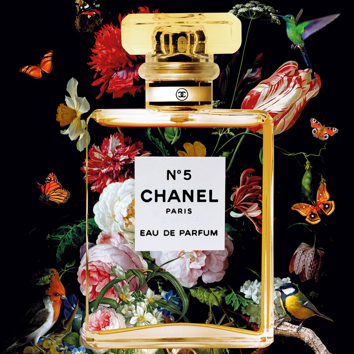 This stunning floral piece contains the classic Chanel no5 fragrance bottle with beautiful botanical details surrounding the perfume. Exuding elegance and charm this artwork has been printed on plexiglass and is a limited-edition piece by artist Harley, part of our curated collection with our partners Cobra Art. Fleur De Chanel Part 1, 100cm x 100cm, Black/Multicoloured - Andrew Martin