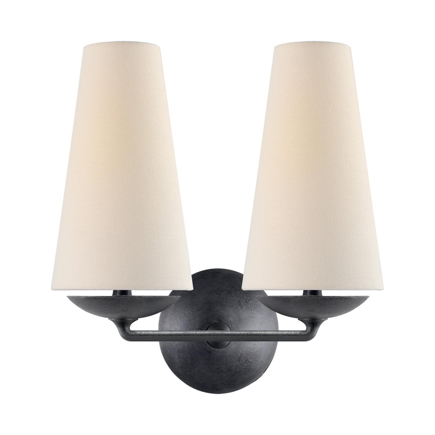The Fontaine wall light in aged iron with a linen shade brings mid-century design and modern texture together for timeless, versatile illumination. Fontaine Double Wall Light Aged Iron, Light, Double - Andrew Martin