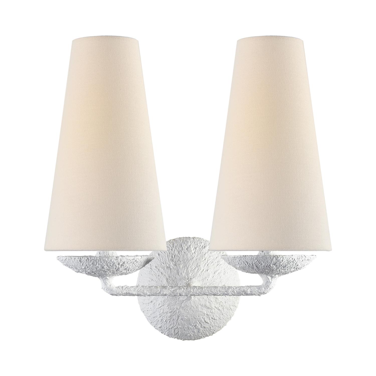The Fontaine wall light in white plaster with a linen shade brings mid-century design and modern texture together for timeless, versatile illumination. Fontaine, Light, Double, Plaster - Andrew Martin