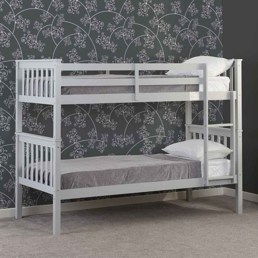 Create a practical and stylish sleeping solution with the Furniture in Fashion, Formaro Wooden Bunk Bed With Ladder in Light Grey, designed to maximise bedroom space while maintaining a modern and calming aesthetic. Finished in a soft light grey tone, this bunk bed blends effortlessly with contemporary interiors, making it an ideal choice for childrens bedrooms, shared spaces, or guest rooms where functionality and style are equally important. Crafted with durability and safety in mind, this wooden bunk bed provides two comfortable sleeping areas within a compact footprint. Its sturdy construction, secure ladder, and protective guard rails ensure dependable everyday use, while the clean design keeps the room looking neat and organised. Perfect for growing families, this bunk bed delivers comfort, practicality, and long-lasting performance. FEATURES: Material: Wooden Finish: Light Grey Mattress not included Designed to fit two standard 3ft single mattresses (not included) Light grey wooden finish offers a modern and versatile bedroom look Space-saving bunk bed design ideal for shared or compact rooms Strong and sturdy construction built for everyday durability Integrated ladder provides safe and easy access to the top bunk Secure side safety rails help protect the upper sleeper Wooden slatted bases provide reliable mattress support and ventilation Can be separated into two single beds for flexible use Maximum recommended weight capacity of 100kg per bunk for dependable support Available at an affordable price Images shown are for illustrative purposes only DIMENSIONS: Height: 157cm Width: 201. 5cm Depth: 103cm