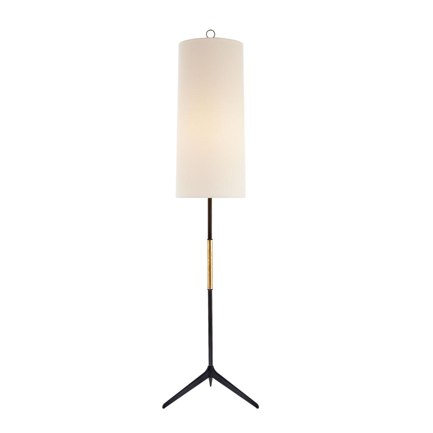 Floor lamp with a black aged iron stem, gilded accents, and long cylindrical linen shade. Designed by AERIN, with European design-led chic. Frankfort Floor Lamp Iron, Floor Lamp, Aged Iron - Andrew Martin