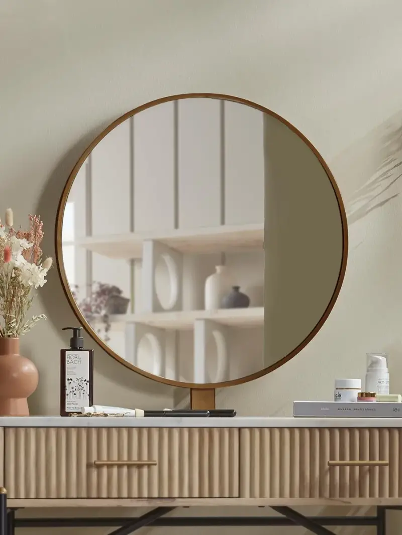Designed to complement our Freja Dressing table, this large round gold toned mirror rises above the dressing table, secured by a metal strut, leaving the full surface of your table free.Discover the complete Freja furniture collection.