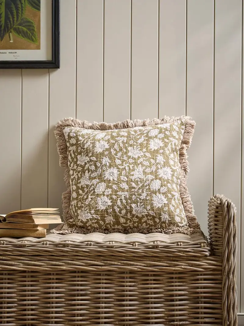 A charming square cushion, brimming with natural cottagecore appeal, features a floral print block-printed on a textured background in a warm honey tone. Filled with feathers for comfort, the cushion is finished with a thick coordinating thread fringe.