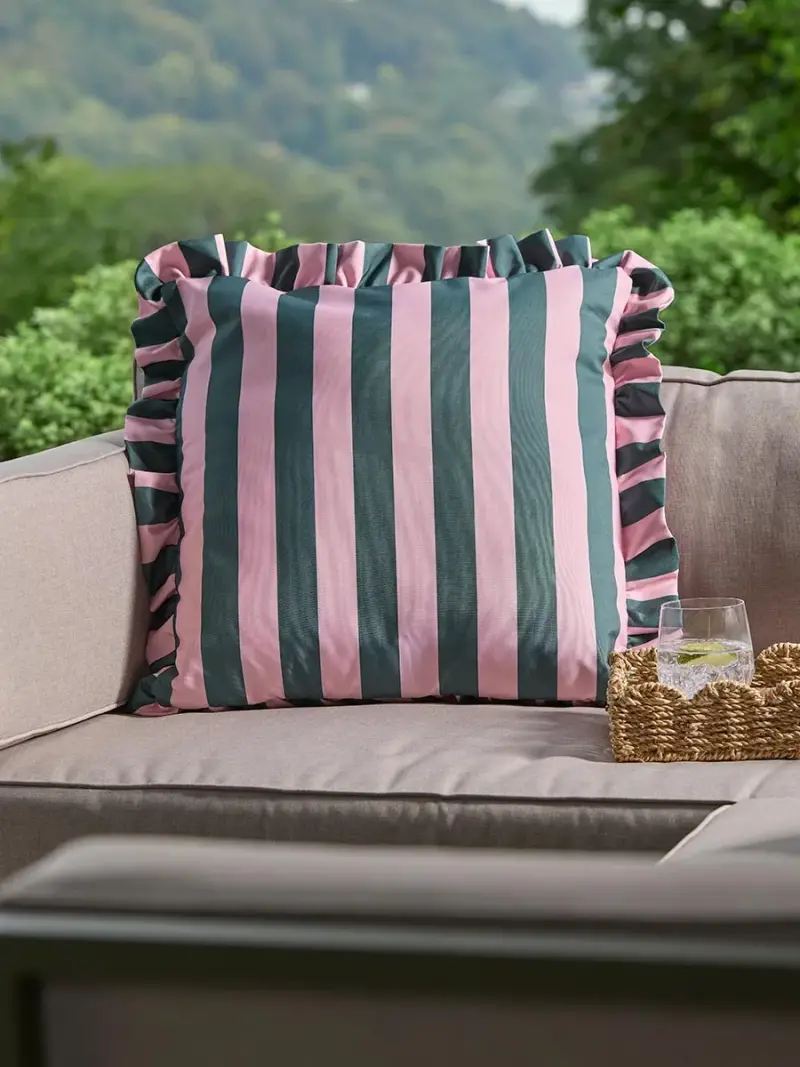 With playful charm and bold colour contrast, our Garden Gals Outdoor Cushion brings a sense of joy and personality to your outdoor setting.Featuring wide candy-pink and deep green stripes framed with a soft ruffled edge, it perfectly balances elegance with whimsy, ideal for brightening garden sofas, loungers, or dining benches.Whether styled as a statement piece or paired with complementary tones, this cushion adds a fresh, colourful twist to classic garden décor.
