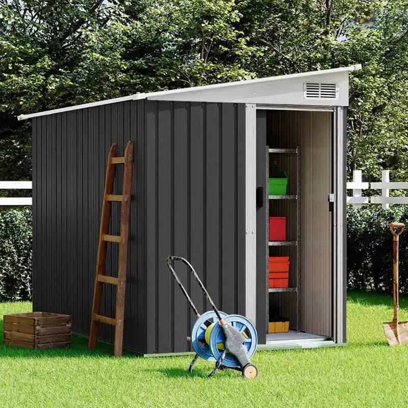 This metal tool shed with a sloped roof is the perfect storage solution. Its distinctive single-slope design is both attractive and allows for placement against a wall without taking up extra space. The sloped roof also helps prevent rainwater from pooling, minimizing the risk of rust and making it suitable for any weather. Whether you need to store tools, tend to plants, or create a small workspace, this tool shed fulfills all your requirements. Features: Made from high-quality zinc steel, it boasts excellent structural stability, ensuring long-lasting durability Featuring a smooth sliding door, it opens without taking up any extra space indoors or outdoors A vent for improved airflow, providing ample ventilation and preventing unpleasant odours The spacious interior comes with two adjustable metal separate shelves, capable of accommodating a variety of items from gardening tools to pool accessories Number of Door(s): 1 Number of Shelves: 2 Door Opening Way: Left Sliding Door Vent Included: Yes Specifications: Dimensions: H:181.0 x W:153.0 x D:206.0 cm Colour: Black Guarantee:Twelve Months Material: Zinc Steel Model Number: GS-F0068 Please note: Each package may arrive on different days due to varying delivery schedules. If you have received only one package, please don't worry, any remaining packages will be delivered within 3 days.
