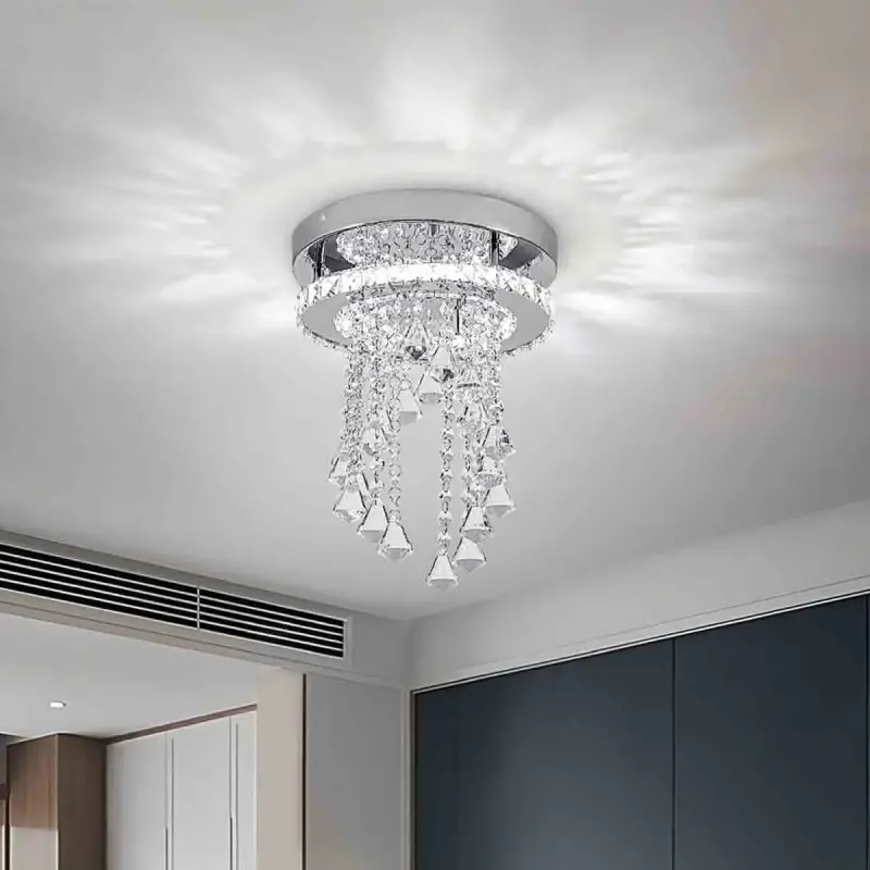 Enhance your home with this multifunctional ceiling light that blends brilliant illumination with stunning decoration. Its cascading crystal droplets create a captivating visual effect, refracting light into a sparkling ambiance. Made from premium crystals for lasting brilliance, this elegant chandelier is perfect for brightening and elevating any interior style Features: High-quality crystals maintain brilliance and clarity over time Captivating arrangement of round crystal droplets for a luxurious touch Perfect addition to entryways, hallways and corridors Finish: Chrome Light Temperature: Cool White Dimmable: No Wattage: 18W Canopy Included: Yes Specifications: Dimensions: H:32 x W:25 x D:25 cm Weight: 2.3 kg Colour: Sliver Guarantee: 12 Months Material: Crystal, Stainless Steel Model Number: GS-LT0246
