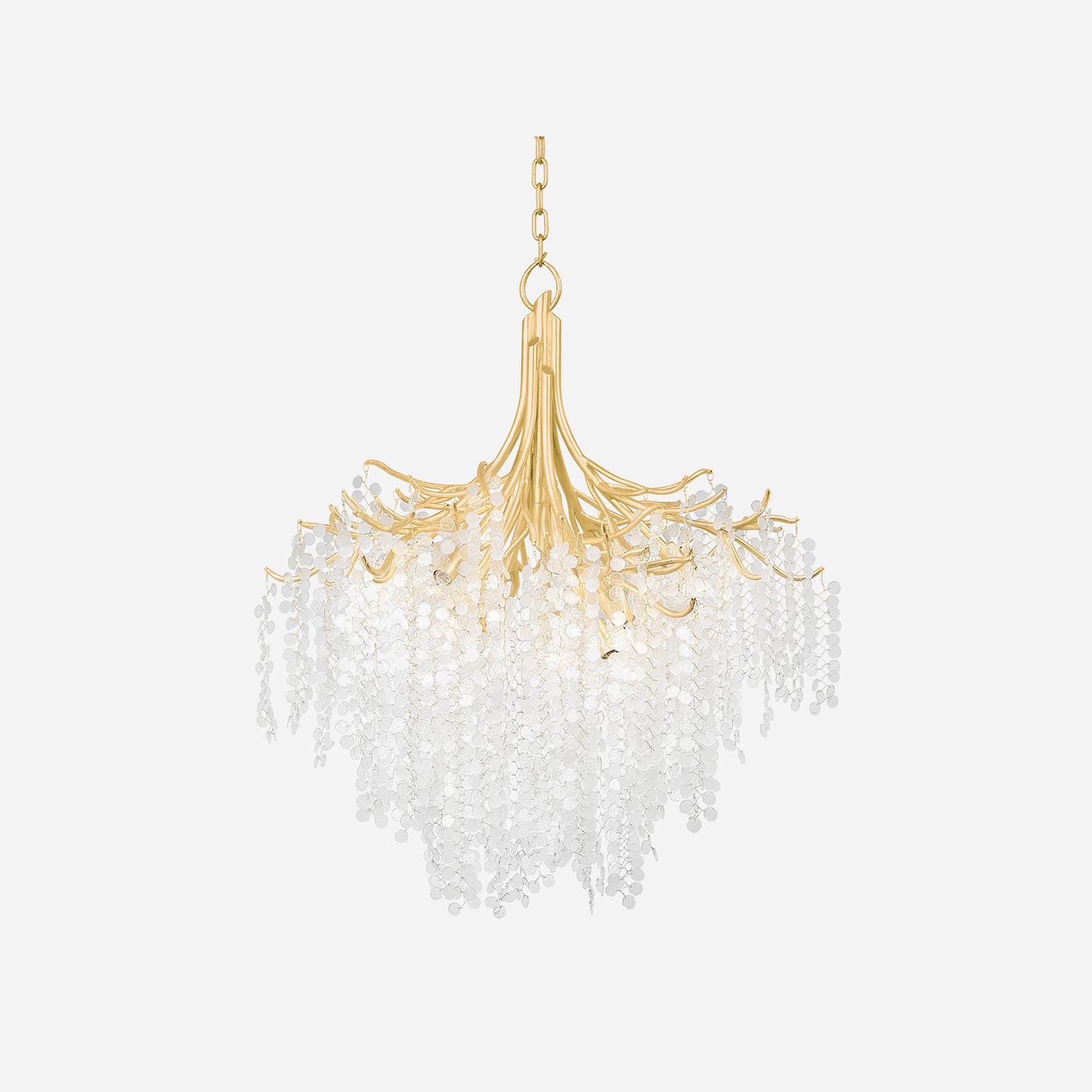 Discover the Genoa Gold Leaf Chandelier. A luxury lighting piece with cascading glass drops and intricate Gold Leaf detailing, perfect for creating an elegant ambiance. Genoa, Light, Gold - Andrew Martin