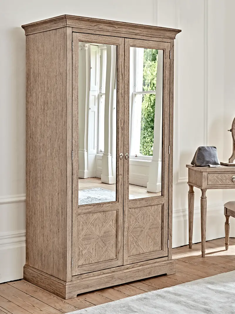 The mindi wood of our Geometric Parquet Wardrobe has a gently brushed finish to give it a coastal feel. A piece of furniture that, with its geometric design, has an elegant, almost stately quality.A traditional plinth top and base and framed mirrored doors finish the decorative element.Explore the complete Geometric Parquet range.
