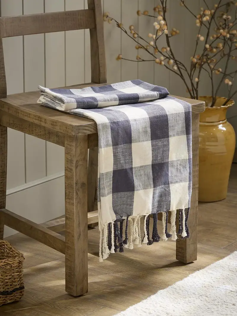 Whether used to keep warm on a cool summer's night in your garden, or to keep cosy by the fire on a rainy day, our Blue Gingham Throw offers an effortlessly stylish and relaxed charm to your home.Woven with a bold navy and cream check, this throw combines classic design with practical durability. Made from a soft yet hardwearing cotton, it's lightweight and easy to care for, making it the perfect companion for both indoor lounging and outdoor entertaining.Finished with delicate tassel fringing, it adds just the right touch of texture and movement to any setting.