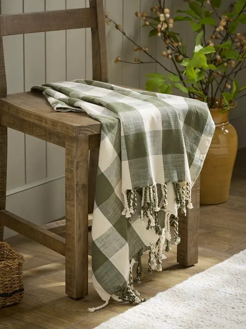 Whether wrapped around your shoulders on a cool summer's evening in the garden or draped over your sofa for a cosy night in, our Green Gingham Throw brings effortless style and relaxed charm to any space.Woven in a soft green and cream check, this throw blends classic design with everyday practicality. Crafted from durable yet beautifully soft cotton, it's lightweight, easy to care for, and perfectly suited to both indoor comfort and outdoor living.Finished with delicate tassel fringing, it adds a gentle touch of texture and movement - a timeless accent for serene, laid-back spaces.