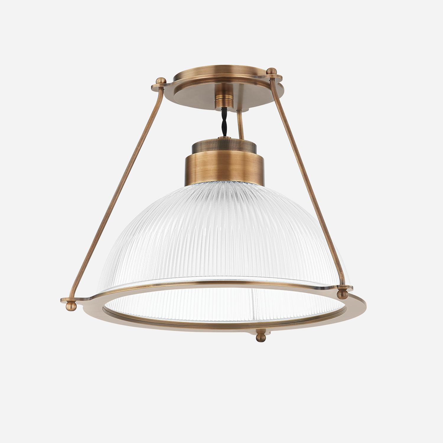 Shop the Glint Flush Mount Ceiling Light in Patina Brass—ribbed Holophane glass and vintage details meet modern design in this striking ceiling fixture. Glint, Light, Medium, Brass - Andrew Martin
