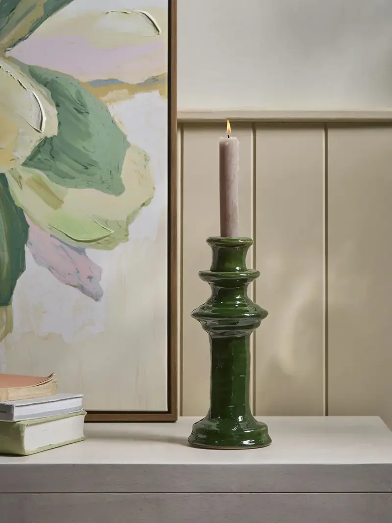 With its artisanal aesthetic, this striking stoneware candle holder features a rich green glaze that adds a vibrant touch to any room in the home. For a timeless look, pair it with simple cream candles, or opt for a contrasting bright colour to create a more dramatic effect.