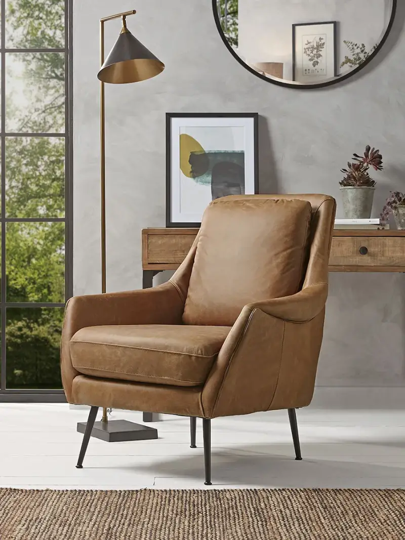 In a lustrous chestnut hue, our Greenwich Leather Armchair sports a little mid-century styling with its generous, boxy silhouette and slim black metal legs.Add a statement floor lamp to create an enviable reading nook, or make it the comfiest spot for movie nights.