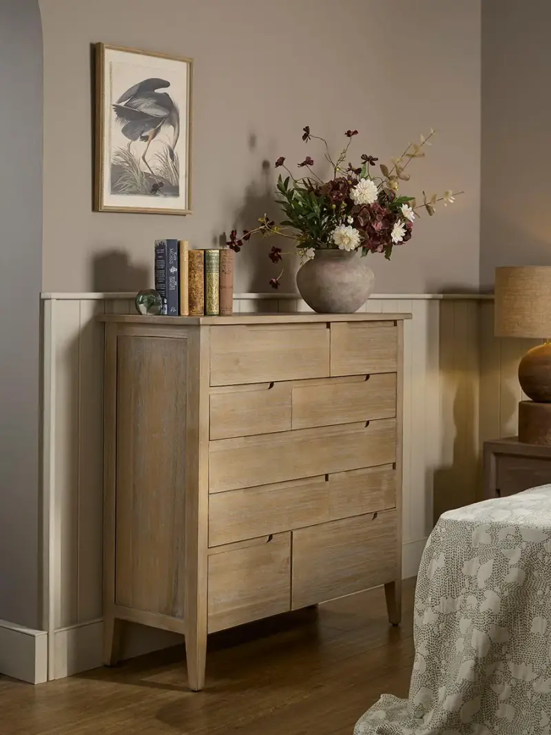 A traditional shape, our Haarby chest of drawers is crafted from poplar, showing the natural grain of the wood beautifully.A unique twist on the standard, the drawers in the chest are all different shapes and sizes, creating an interesting feature to look at.Enhancing the contemporary feel are curved grooves for handles, creating a sleek design that fits in a variety of bedroom styles.