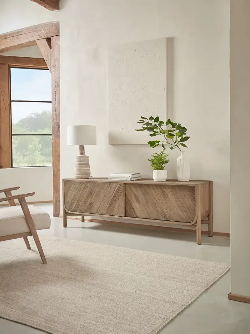 The beauty of natural wood has truly been allowed to shine in our Halden Media Unit where the tones of grain range from palest honey to grey on the diagonal striped parquet effect front. With a tubular wooden frame and softly rounded corners, this versatile piece will add character to a neutral scheme. Sliding doors make it a good choice for smaller rooms and ample storage space is available for hiding games consoles and other media equipment.