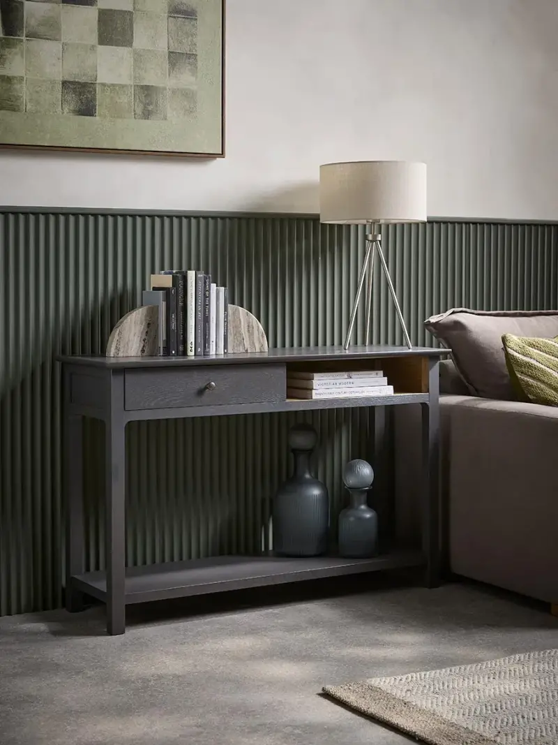 Perfectly crafted from white oak and plywood, this console table features a dark finish which works beautifully in modern interiors.With an open drawer for displaying coffee table books and a drawer for concealing bits and bobs, this console table fits wonderfully in a hallway or behind a sofa.