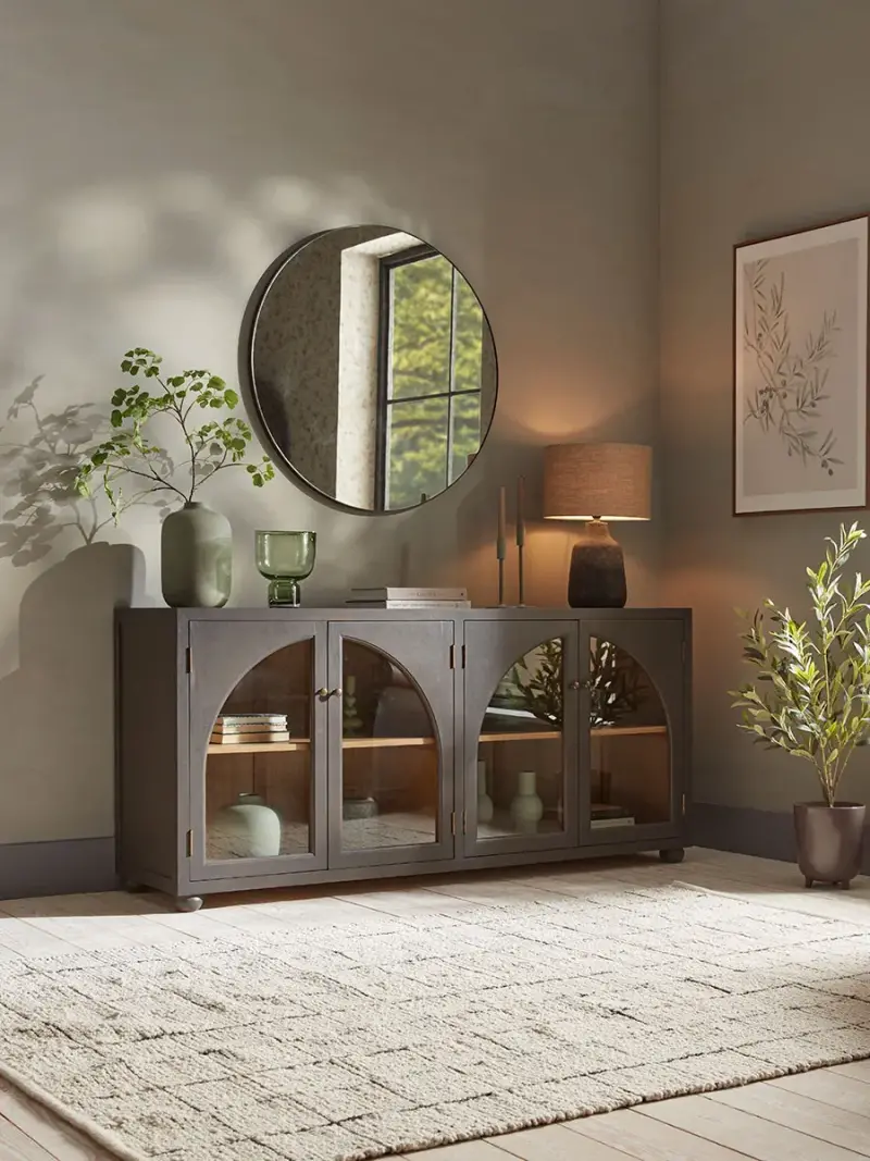 Beautifully curved glass arches feature on the doors of our Hamar Sideboard, allowing you to display your favourite accessories on the shelves inside.In a dark grey, the painted wood has a softness to it, which is enhanced by the rounded ball feet for a sideboard that sits wonderfully in a modern interior.
