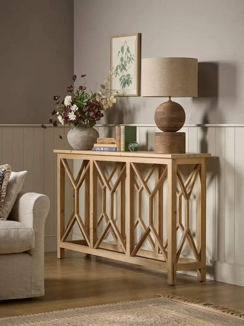 Bold yet elegant, our Hamina Console Table adds a splendid feature to your home. Crafted from reclaimed fir, the simple structure is finished with architectural detailing, creating a console that stands alone in its own right. Ideal for a living or dining space, dress with a table lamp and some faux flowers.