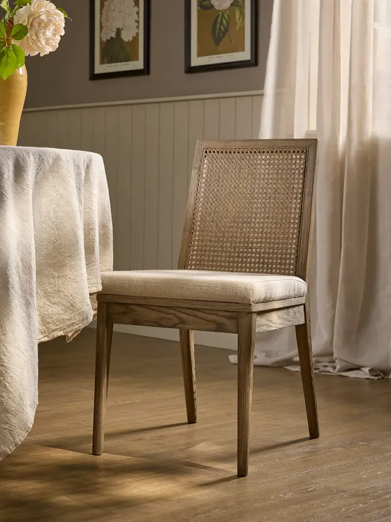Bring understated elegance to your dining space with the Hammel Dining Chair, a beautifully crafted piece that balances natural texture with timeless form.The warm wooden frame is paired with a handwoven cane back, creating a light, airy silhouette that feels both classic and contemporary. A softly cushioned seat adds comfort for everyday dining, while the clean lines and subtle detailing give the chair a refined, furniture-like presence.