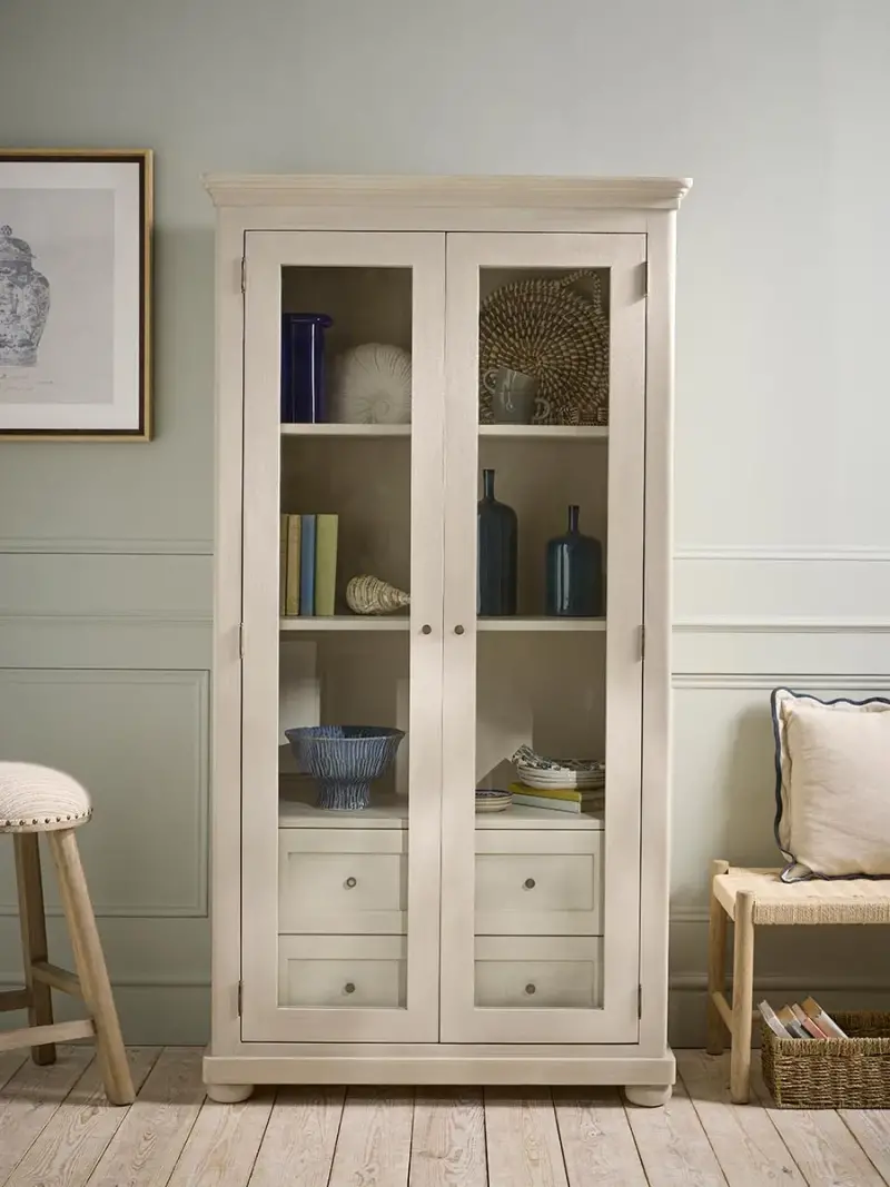 Our Hanko display cabinet provides an ideal combination of display space and concealed storage.Finished in a soft, greyish-white painted wood, the cabinet features glazed doors that reveal two shelves and a base with two drawers.With a neat cornice at the top and clean, simple lines, this timeless piece complements any room in the home.