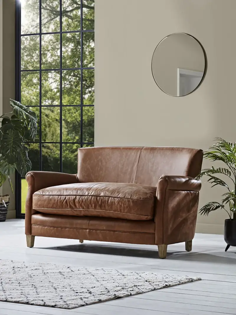 Create a warm, distinguished feel in your living space with our Hardwick Leather Sofa. Wonderfully soft, the high quality leather has an authentically aged look for added character. With angular ash legs and burnished metal stud detail along the back, this cosy two-seater sofa will elevate any setting.