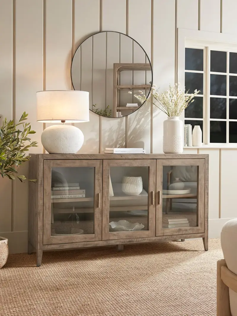 Crafted from pine, our Harlow sideboard has a distressed rustic feel to it. With a blocky structure, the glass doors create a softness to the piece. The brass colour handles paired with this allow for a unified, laid-back style.The openness of the glass allows you to store and display items beautifully, like your dinnerware in your dining space.Pair with our Harlow console table and shelving unit.