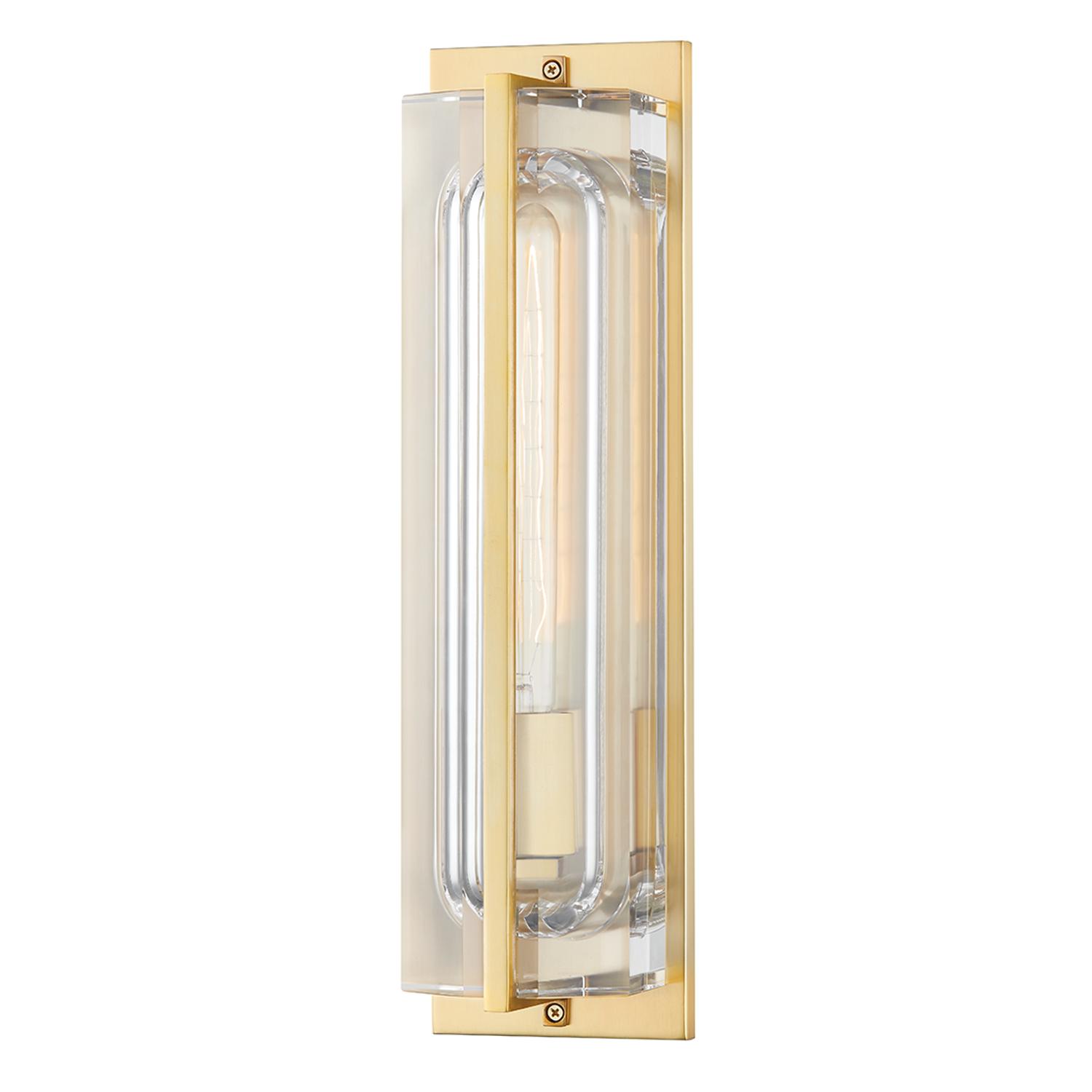 Sophisticated and intricately designed, Hawkins features a thick piece of high-quality crystal scooped out and faceted on the inside to make room for a tubular glass shade, metal socket and incandescent tube bulb. Hawkins Wall Light, Wall Light, Brass - Andrew Martin