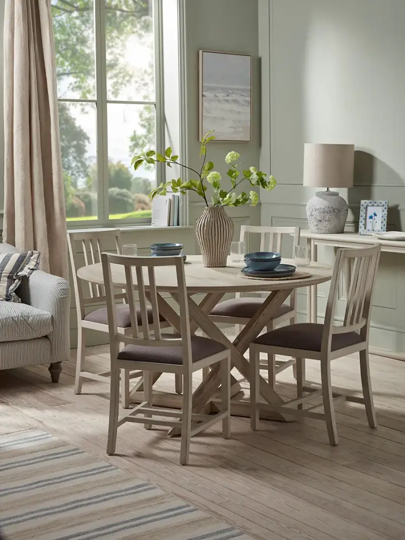 Transform your dining space with our Herning Dining Table.Made from recycled pine with a gentle washed finish which allows the natural grain to be appreciated, this round table has a cross-legged design which adds additional interest.Fitting perfectly in a kitchen corner or a smaller dining space, this table has a fresh and vibrant look - the perfect addition to our French Blue collection.