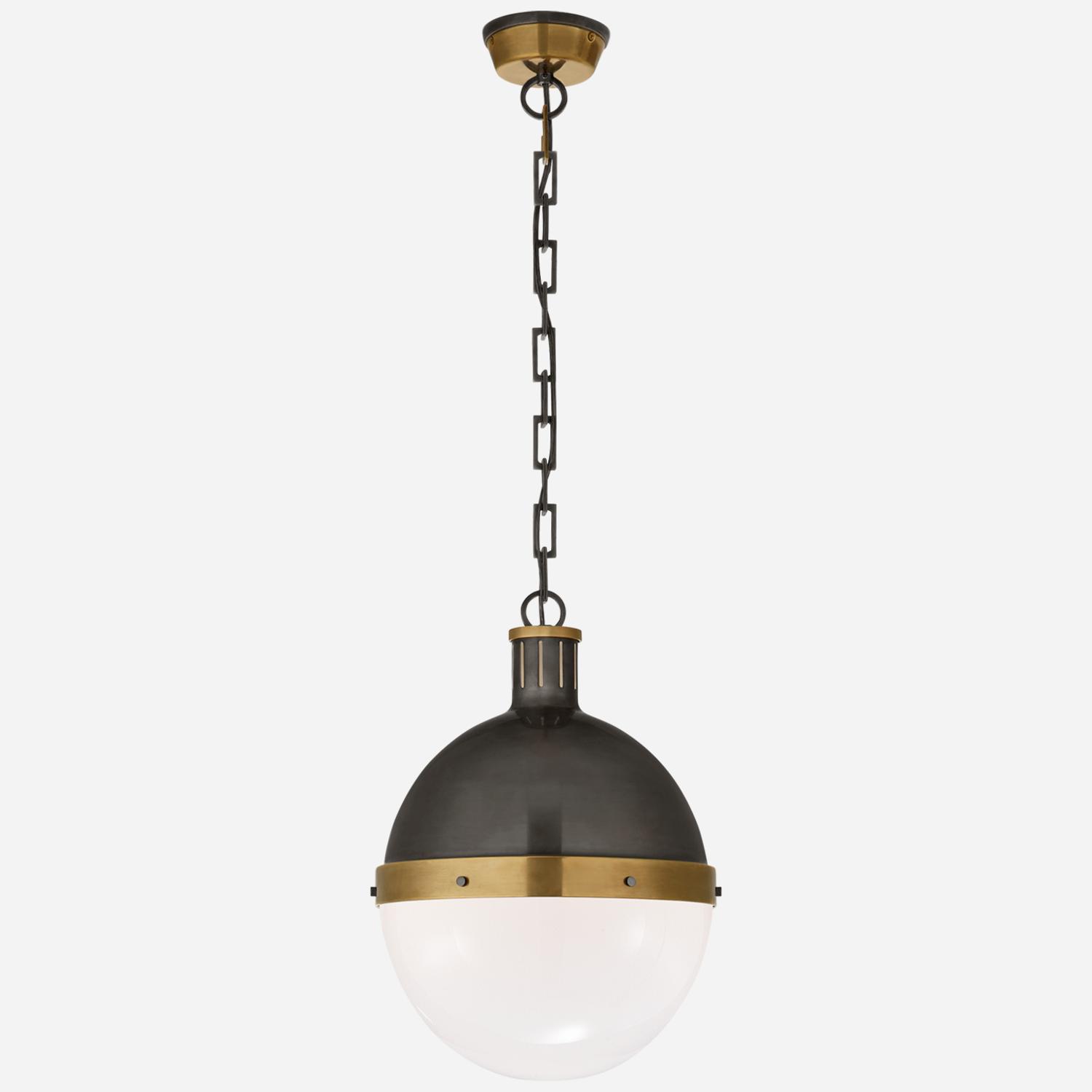 A ball pendant light, crafted by iconic designer Thomas O'Brien, featuring the top half in bronze with hand-rubbed antique brass fixings and the bottom half in contrasting white glass. Bold and modern, Hicks hangs as a cool statement light giving an industrial edge to a kitchen, dining room or hallway. Hicks Pendant Bronze, Pendant Light, Large - Andrew Martin