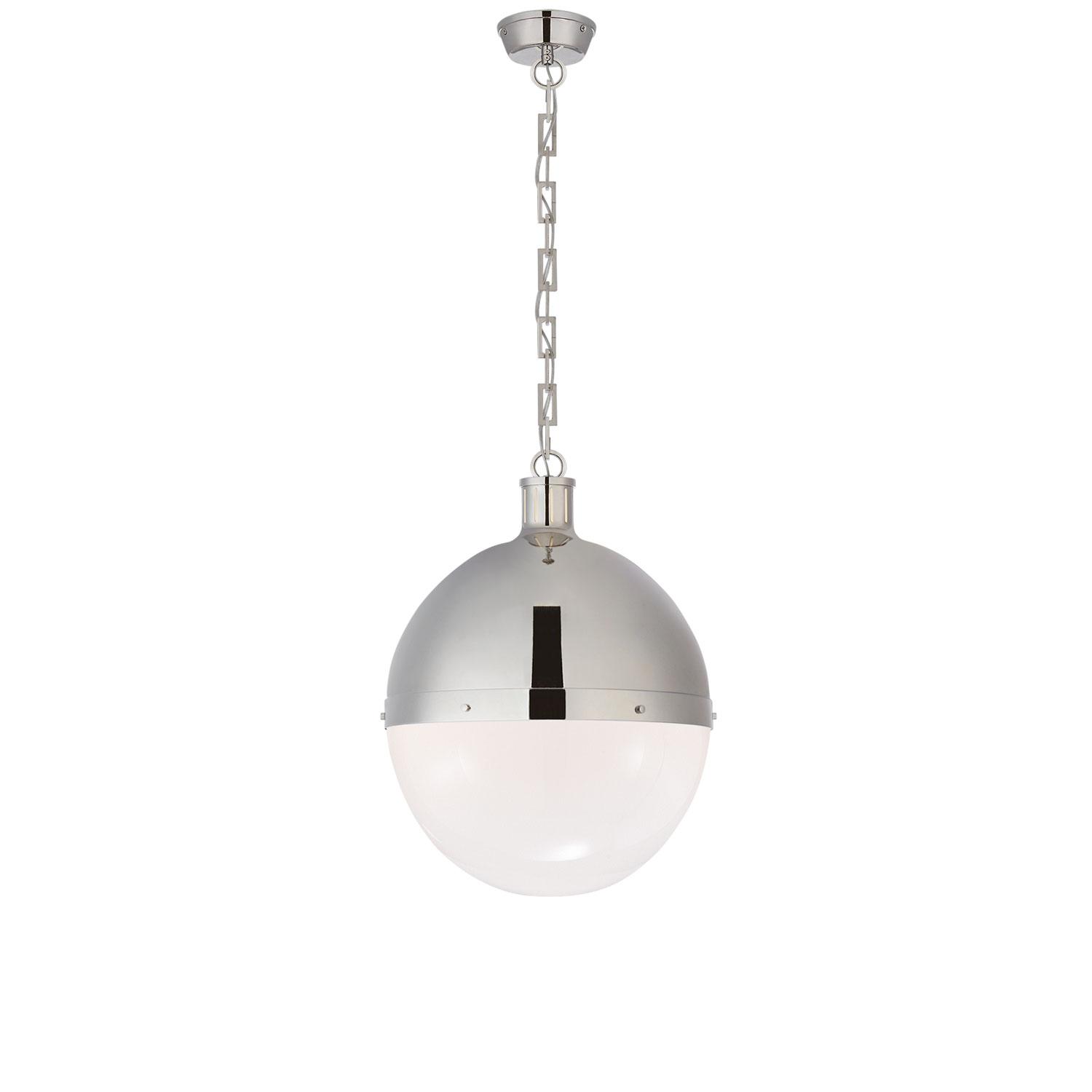 Ball pendant light, crafted by iconic designer Thomas O’Brien, half in polished nickel and half in contrasting white glass. Hicks Pendant Nickel, Pendant Light, Extra Large, Polished Nickel - Andrew Martin