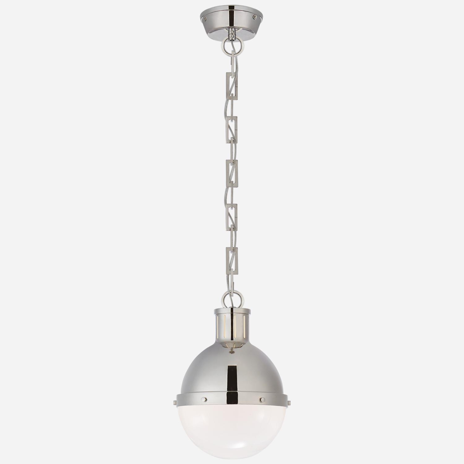 A ball pendant light, crafted by iconic designer Thomas O'Brien, featuring the top half and fixings in polished nickel and the bottom half in contrasting white glass. Bold and modern, Hicks hangs as a cool statement light giving an industrial edge to a kitchen, dining room or hallway. Hicks Pendant Nickel, Pendant Light, Small, Polished Nickel - Andrew Martin
