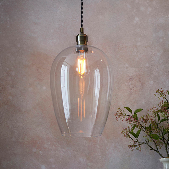 FEATURES : Hixson Large Clear Glass Ceiling Pendant Light In Antique Brass High quality clear blown glass Antique brass plated metalwork Height adjustable 1. 2 metre twisted black fabric cable Dimmable Twin with E27 LED filament lamps for that unique 'on trend' look Available at an affordable price Images shown are for illustration purpose only DIMENSIONS : Height : 570mm to 1675mm Diameter : 250mm
