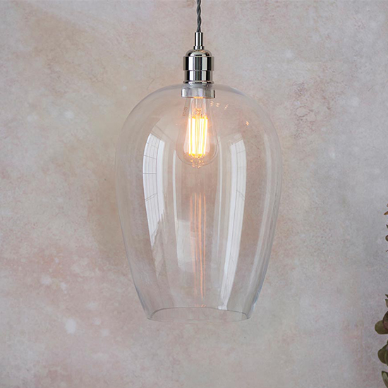 FEATURES : Hixson Large Clear Glass Ceiling Pendant Light In Bright Nickel 10W LED E27 (bulb not included) High quality clear blown glass Polished nickel metalwork Height adjustable 1. 2 metre twisted grey fabric cable Dimmable Twin with E27 LED filament lamps for that unique 'on trend' look Available at an affordable price Images shown are for illustration purpose only DIMENSIONS : Height : 570mm to 1675mm Diameter : 250mm