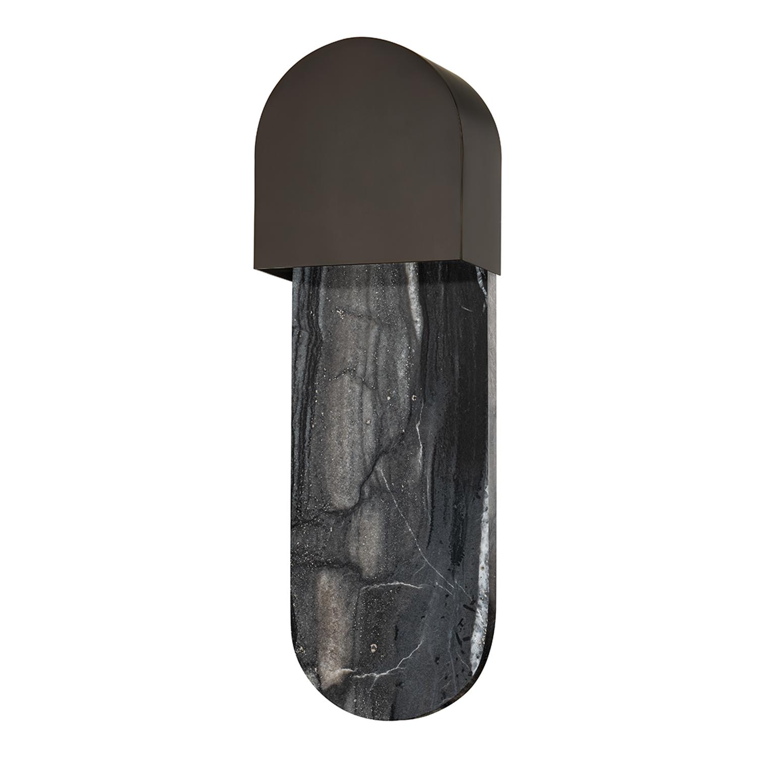 Hobart makes a bold statement. Sleek yet edgy, light pours from the aged or black brass shade to highlight the natural beauty of the travertine or nero madera marble stone beneath. Hobart Wall Light Black, Wall Light, Black Brass - Andrew Martin