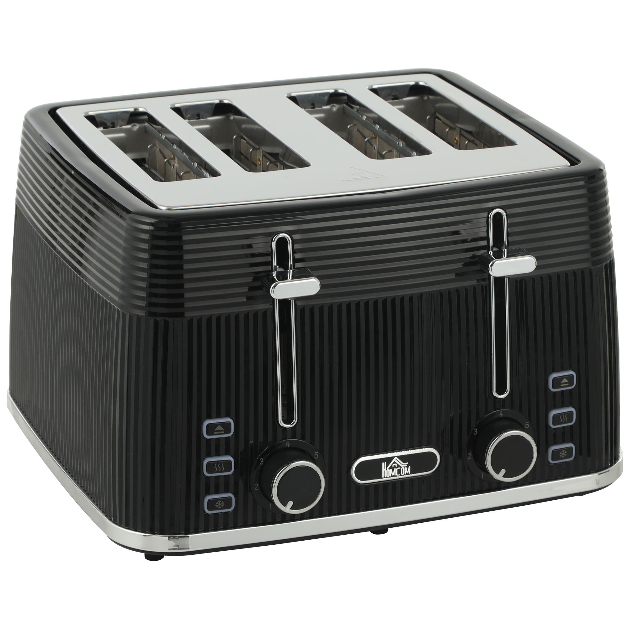 Morning chaos often means compromising on breakfast or waiting in line for the toaster. This daily scramble can leave family members with burnt or underdone toast starting the day with frustration. The HOMCOM 4-slice toaster resolves this with dual controls for its four slots, seven browning settings and a defrost function. This versatile black toaster ensures everyone gets their perfect slice even from frozen transforming stressful mornings into moments of personalized convenience and calm.Features:This toaster has dual independent controls, great for busy family morningsChoose from seven browning settings for your fully customized slice of toastEasily defrost, reheat or cancel the cycle with simple one-touch buttonsAutomatic centering guides ensure every slice is evenly toasted and pops upFeatures two removable crumb trays for quick and effortless cleanupNo assembly required