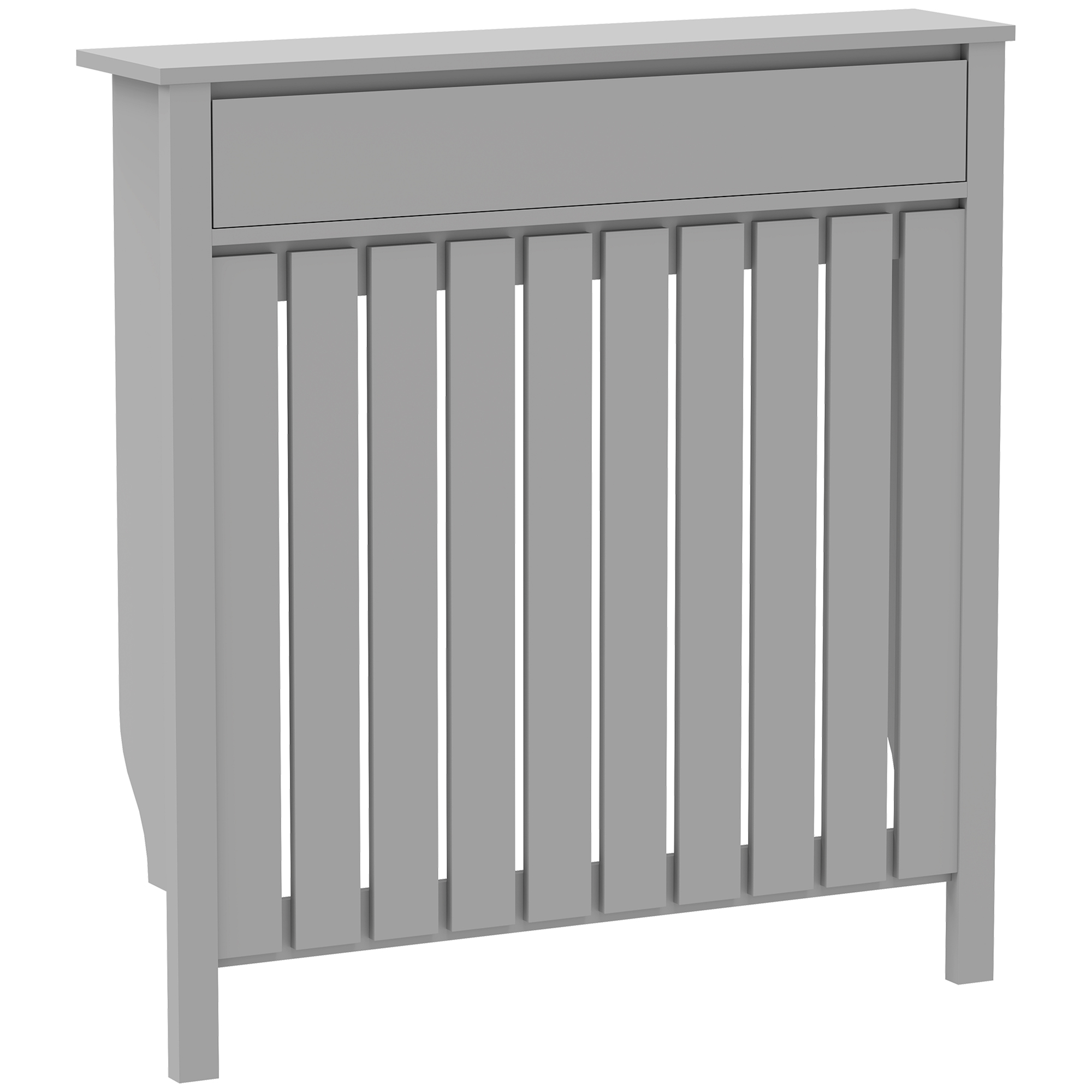 Radiator safety is given a rustic touch with this HOMCOM slim radiator cover. With all-grey body, this is a striking industrial design, which brings character into your home. Thanks to the vertical slats, heat is able to escape, so a warm space is not compromised. MDF radiator cover is complete with a top drawer to keep small items in a memorable place.Features:Vertical slats allow heat out, while safely shielding the radiator so you don't touch itA top drawer for handy storage. Flat top for extra display and holding spaceAll grey body: a striking industrial designAccessories included to mount on and take off easily. Pre cut-outs for a neat fit against the wallQuality MDF and particle board blendMaximum load 14kg, easy to assemble