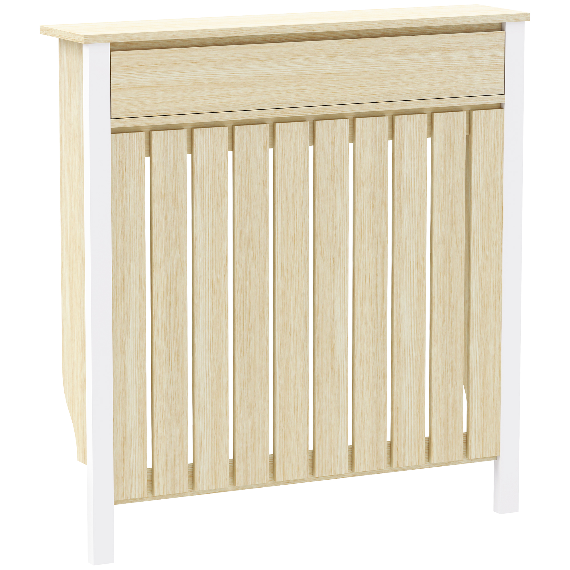 Radiator safety is given a rustic touch with this HOMCOM slim radiator cover. With a white frame and oak wood-effect, this is a striking industrial design, which brings character into your home. Thanks to the vertical slats, heat is able to escape, so a warm space is not compromised. MDF radiator cover is complete with a top drawer to keep small items in a memorable place.Features:Vertical slats allow heat out, while safely shielding the radiator so you don't touch itA top drawer for handy storage. Flat top for extra display and holding spaceWhite frame with a oak wood-effect body: a striking industrial designAccessories included to mount on and take off easily. Pre cut-outs for a neat fit against the wallQuality MDF and particle board blendMaximum load 14kg, easy to assemble