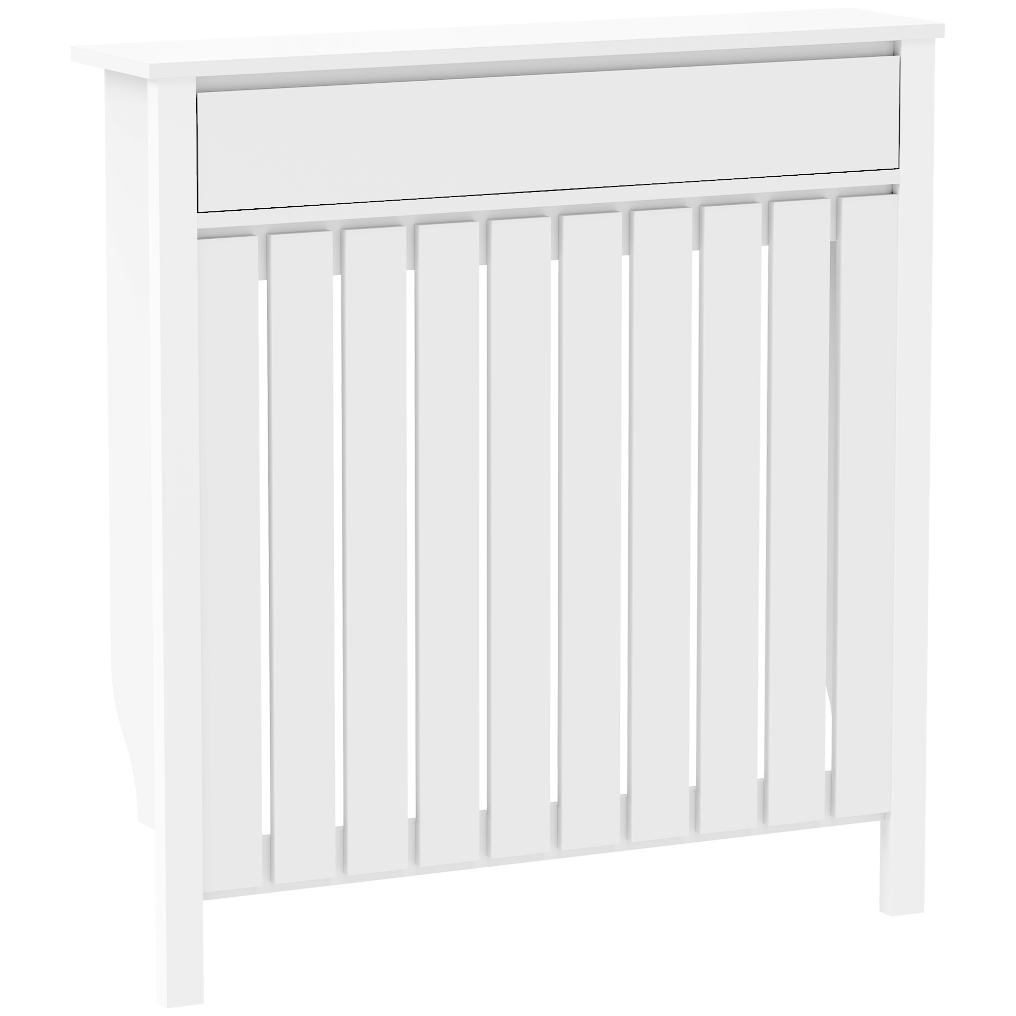 Radiator safety is given a rustic touch with this HOMCOM slim radiator cover. With all white body, this is a striking industrial design, which brings character into your home. Thanks to the vertical slats, heat is able to escape, so a warm space is not compromised. MDF radiator cover is complete with a top drawer to keep small items in a memorable place.Features:Vertical slats allow heat out, while safely shielding the radiator so you don't touch itA top drawer for handy storage. Flat top for extra display and holding spaceAll-white body: a striking industrial designAccessories included to mount on and take off easily. Pre cut-outs for a neat fit against the wallQuality MDF and particle board blendMaximum load 14kg, easy to assemble