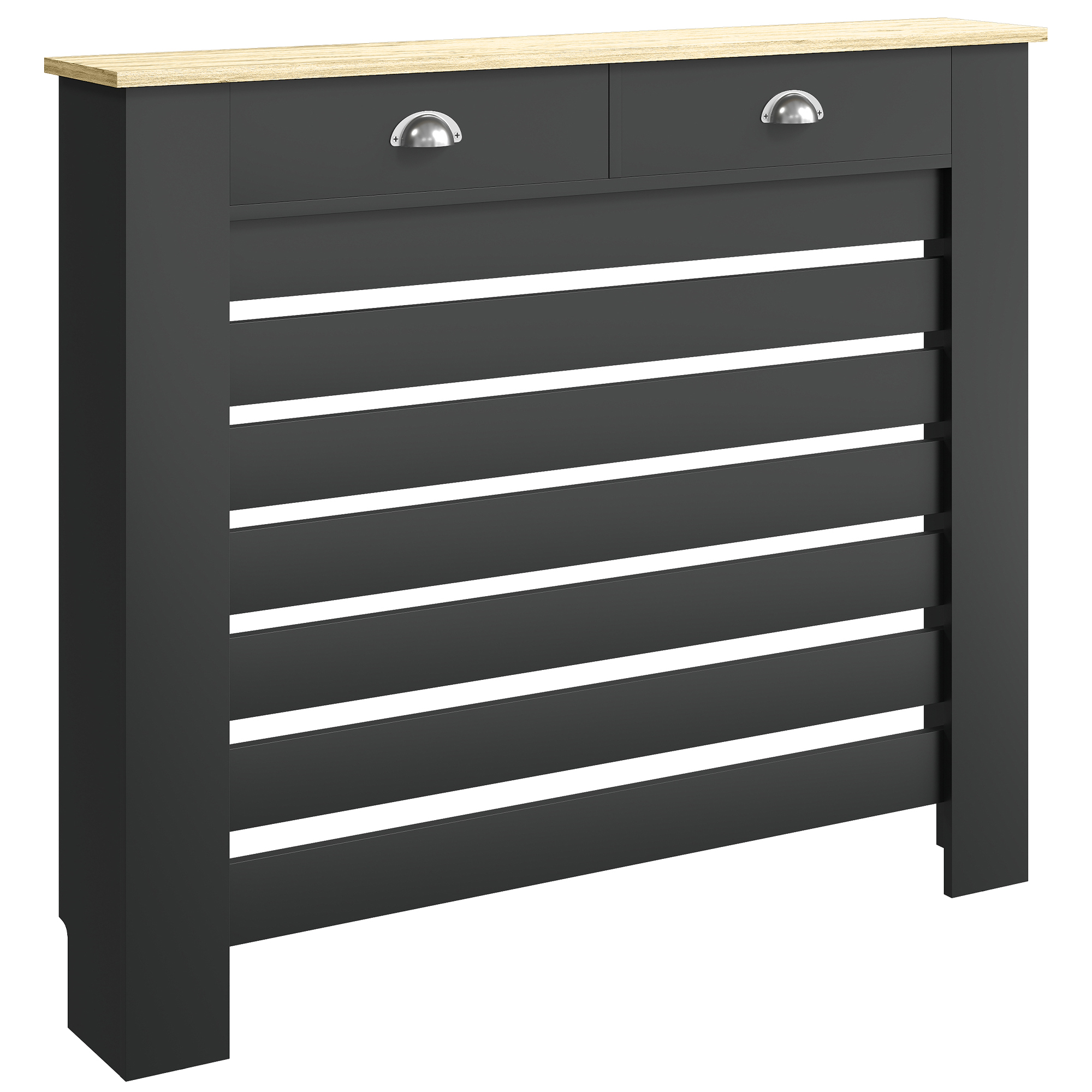 A safe and stylish addition to the home—this HOMCOM slim radiator cover. Made from a robust blend of MDF and particle board, it comes in a slatted design to allow the heat to escape: keeps your space warm and cosy whilst protecting you from directly touching the radiator for safety. Heating cover is complete with a handy top drawer for storage.Features:Protective slatted design allows heat out too. Bottom space to fit over skirting boardVersatile muted black, with a wood-effect top for a classic touchKeeps you safe from hot radiatorsTop drawers mean handy storageEasy-to-fix clips to attach and remove easily