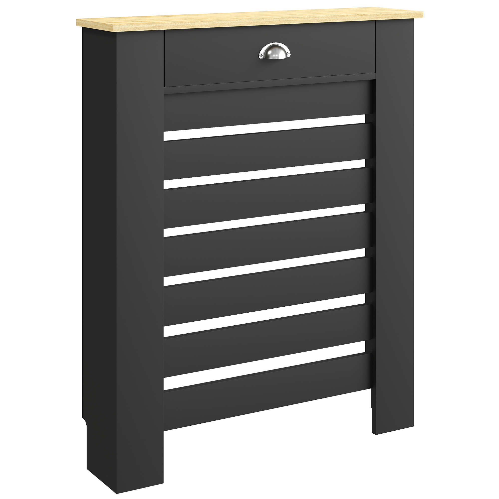 A safe and stylish addition to the home—this HOMCOM slim radiator cover. Made from a robust blend of MDF and particle board, it comes in a slatted design to allow the heat to escape: keeps your space warm and cosy whilst protecting you from directly touching the radiator for safety. Heating cover is complete with a handy top drawer for storage.Features:Protective slatted design allows heat out too. Bottom space to fit over skirting boardVersatile muted black, with a wood-effect top for a classic touchKeeps you safe from hot radiatorsTop drawers mean handy storageEasy-to-fix clips to attach and remove easily