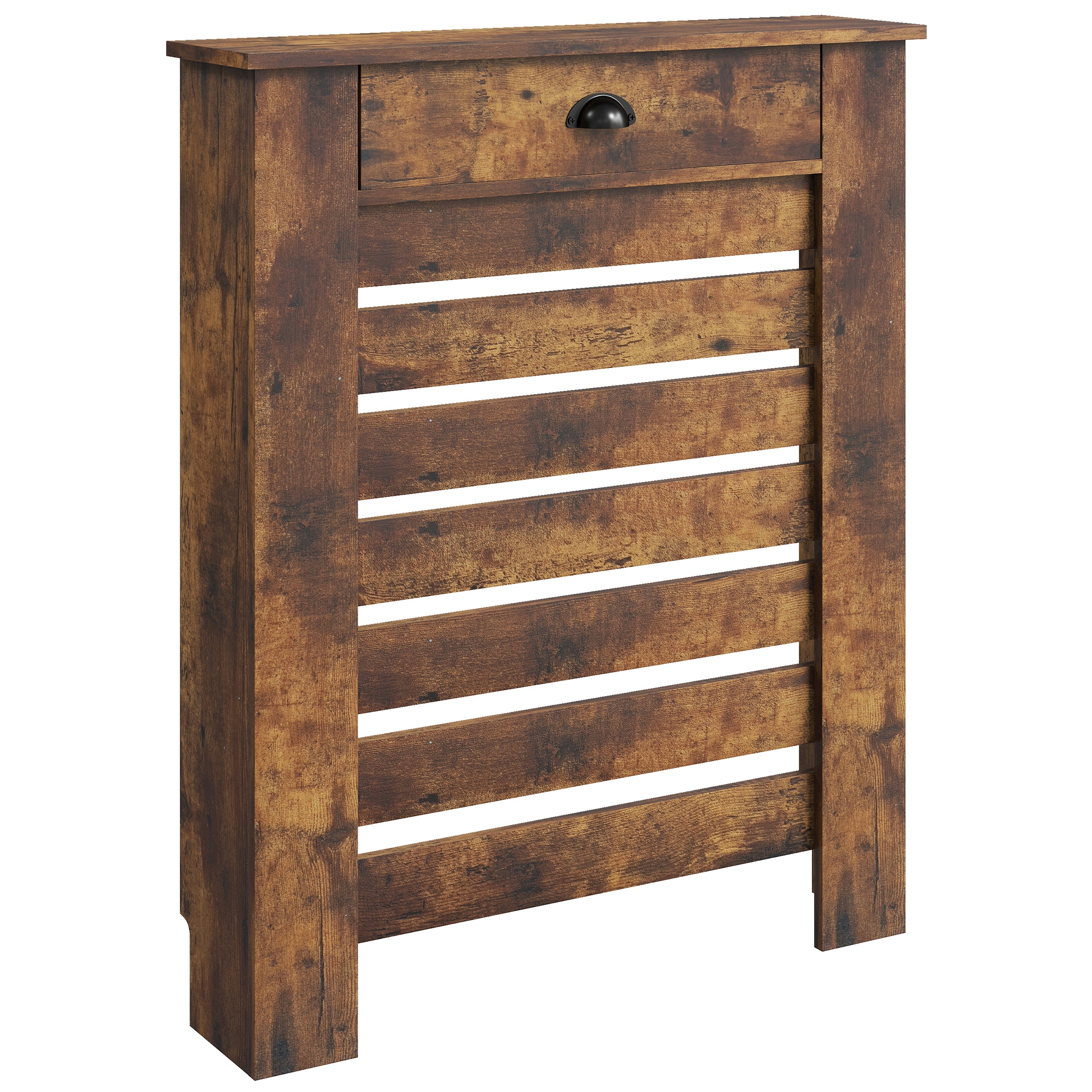 A safe and stylish addition to the home—this HOMCOM slim radiator cover. Made from a robust blend of MDF and particle board, it comes in a slatted design to allow the heat to escape: keeps your space warm and cosy whilst protecting you from directly touching the radiator for safety. Heating cover is complete with a handy top drawer for storage.Features:Protective slatted design allows heat out too. Bottom space to fit over skirting boardVersatile muted rustic brown, with a wood-effect top for a classic touchKeeps you safe from hot radiatorsTop drawers mean handy storageEasy-to-fix clips to attach and remove easily