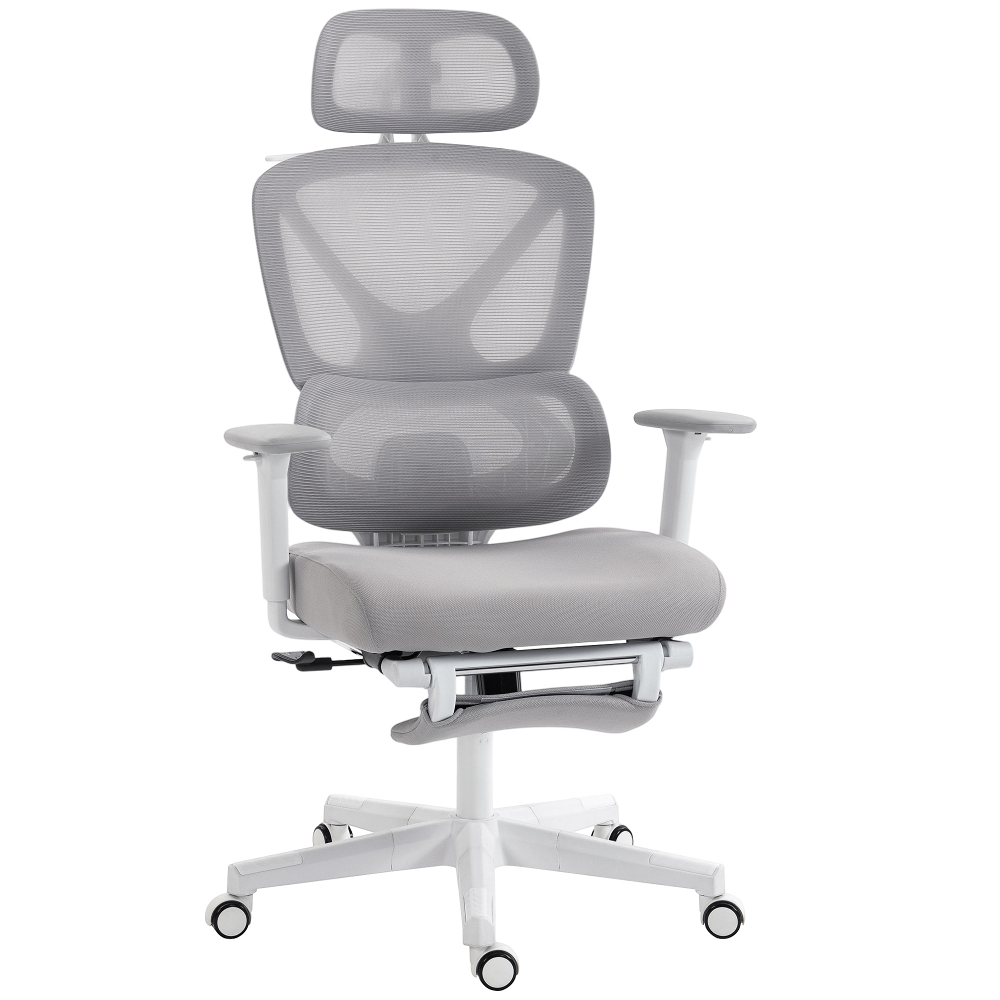 All-day working comfort and support with this HOMCOM ergonomic chair. Enjoy the customisable headrest and lumbar support - set to the positions you want. Filled with high-density foam for plenty of comfort, with mesh fabric for breathability. The back reclines to a maximum 135° angle - paired with the manual legrest to elevate and relax the whole body. Complete with wheels to move around easily.Features:Headrest rotates and adjusts height, 3D armrests adjust forward/backward, up/down and rotatingLumbar support moves forward, backward, up and down for back comfortBreathable mesh fabric keeps you cool during long hoursHigh-density foam padding offers enduring seat comfortTilt function, 135° reclining with footrest for relaxationBuilt-in coat hanger at the back for convenient storagePU wheels glide effortlessly across different floor typesAdjustable height from 115-125cm to suit various users