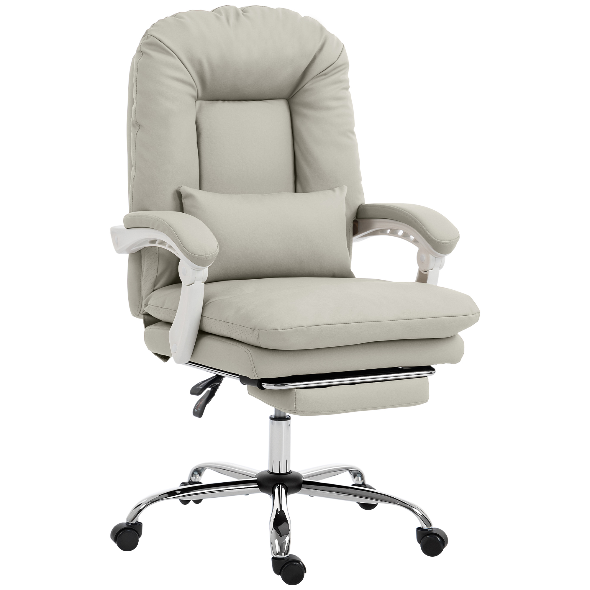 Office chair fatigue from long hours can drain your productivity and leave you aching. The discomfort makes it hard to focus, turning your workday into a struggle. This HOMCOM desk chair offers a welcome escape. Sink into its plush cushioning, recline up to 155° with the footrest and adjust the versatile lumbar pillow for personalized support. Find your comfort zone and transform how you work with this ergonomic executive office chairFeatures:Recline up to 155° with a retractable footrest for enhanced relaxationSink into the thickly padded 16.5 cm seat and 17 cm backrestA versatile lumbar pillow provides support or doubles as a headrestThe PU and synthetic surface of this office chair is waterproof and easy to cleanCertified to EN1335 and BS5852 for ensusing safety and long-lasting useElectroplated base and Class 3 gas lift support up to 120 kgAssembly required