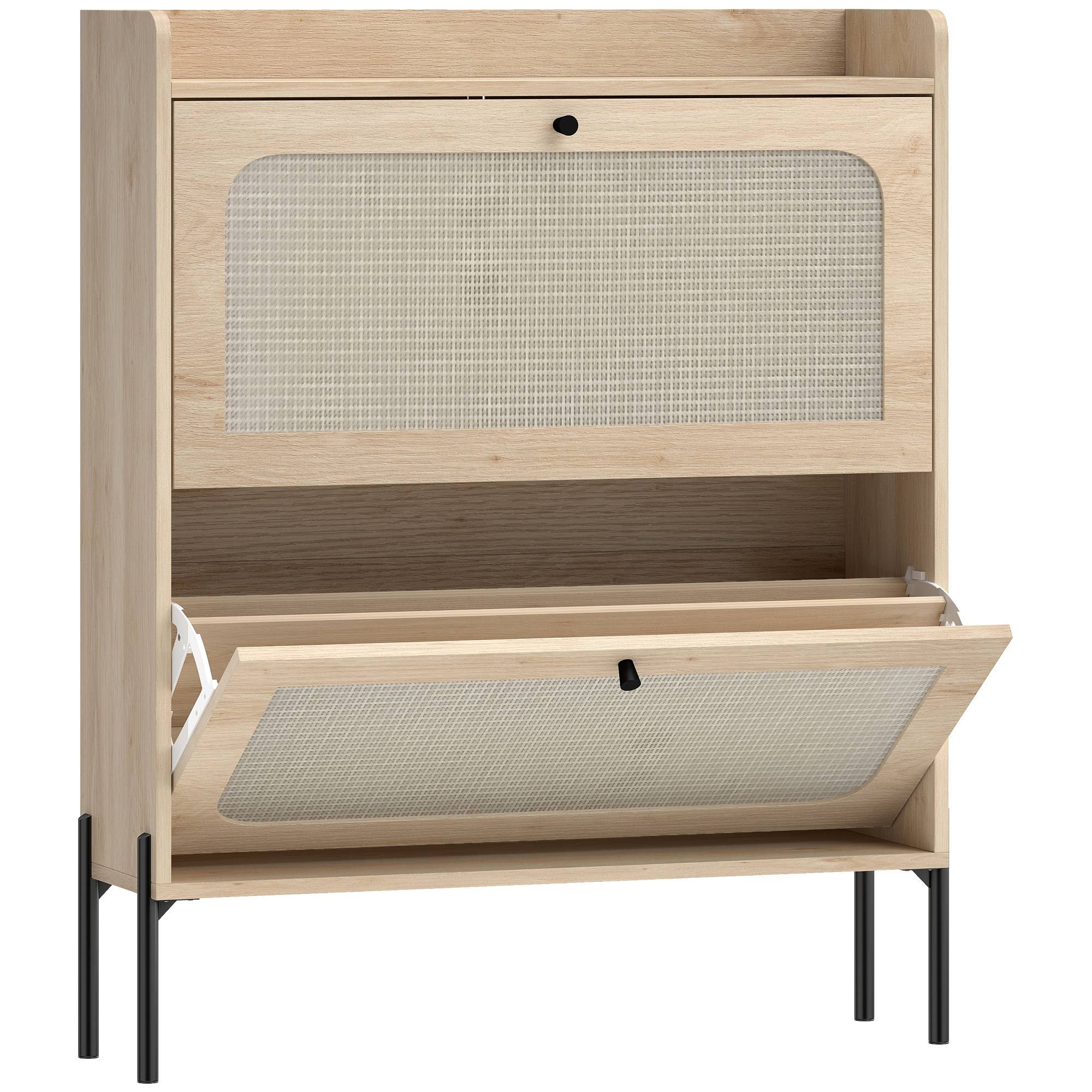 Tidy up your space with the HOMCOM Shoe Cabinet! Effortlessly store 12-16 pairs of shoes in two flip drawers, keeping your hallway clutter-free. Adjustable and removable shelves mean even your boots have a home, while the raised top offers quick access to essentials. With a slim 23.7 cm depth, this slim shoe cabinet is great for narrow spaces. Plus, the rattan detailing and oak finish add a touch of Boho chic to your entryway.Features:Large capacity shoe storage neatly organizes 12-16 pairs effortlesslyAdjustable and removable shelves fit boots or shoes for customized organizationRaised top offers quick access to keys, walletsand other essentialsNarrow 23.7 cm depth saves space in slim hallwaysRattan fronts and oak finish add Bohemian charmRobust particleboard construction and steel legs supports 40 kg for reliable longevityMelamine coating resists stains and simplifies cleaning maintenanceAnti-tipping hardware keeps the cabinet securely anchored