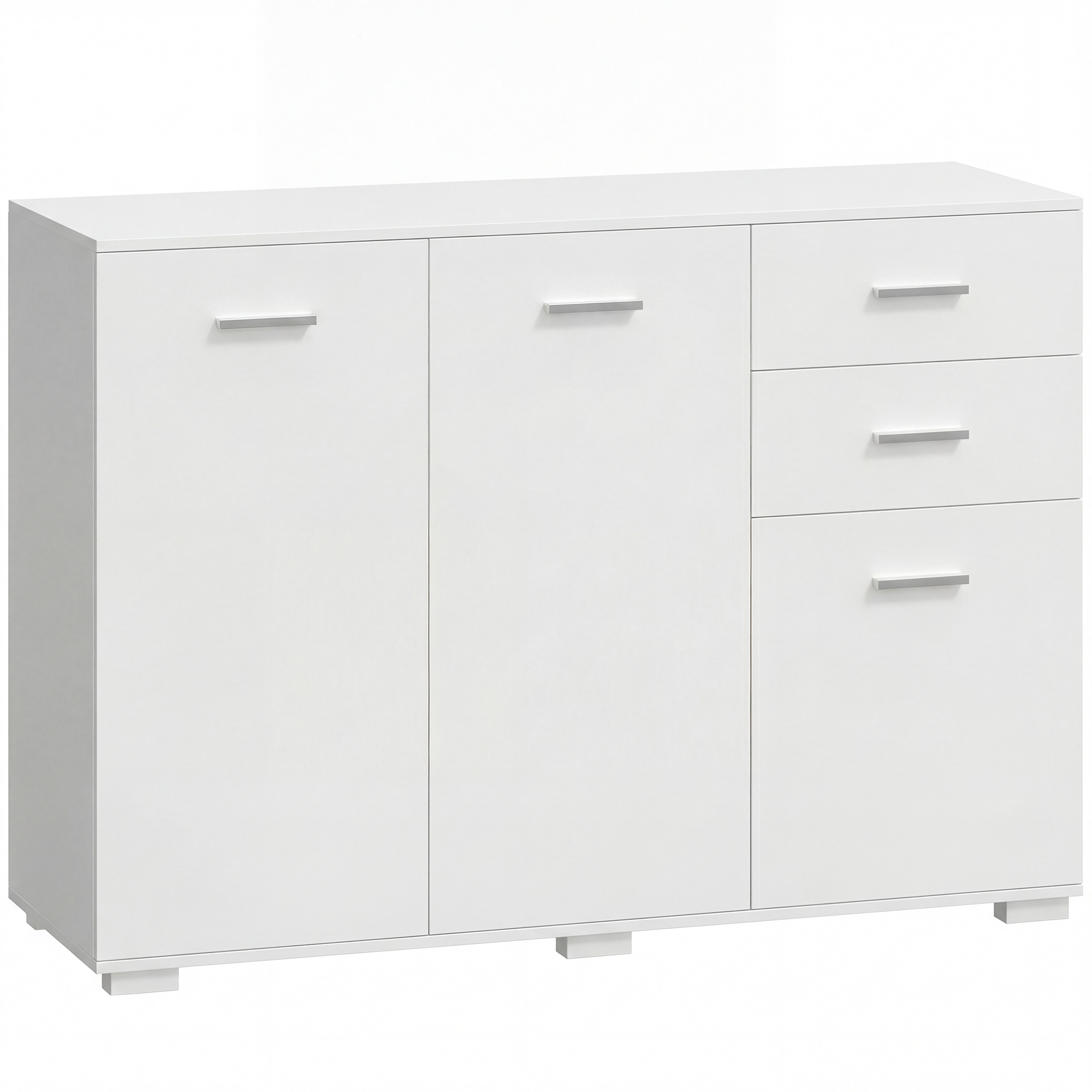 Decluttering made modern with this HOMCOM sideboard. A clean white design for a modern look, making it suitable for plenty of living and dining spaces. It comes with two drawers, a small and a large cupboard, as well as a flat top: plenty of room for holding tableware, silverware, small appliances and more. The large cupboard features a five-level adjustable shelf to fit in differently-sized items. Complete with anti-tipping straps to attach to a wall safely.Features:Two drawers, small cupboard, large cupboard and flat table topFive-level adjustable shelf in large cupboard to fit differently-sized itemsClean white design is modern, with sleek polished handlesParticle board structure is stableSix feet for balance and floor protectionAnti-tipping straps included to safely attach to wallMaximum load 50kg, assembly required